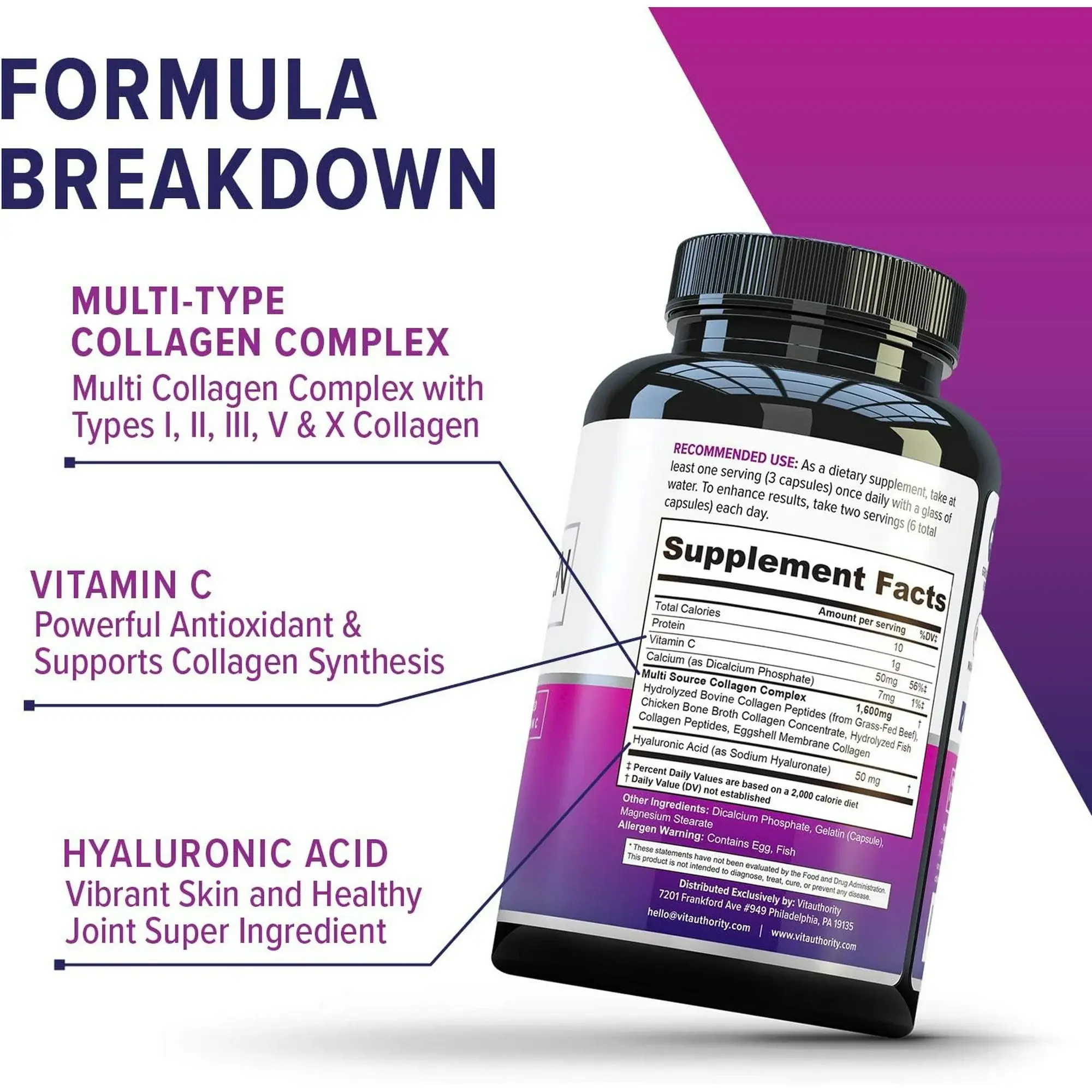 Transform your health and beauty routine with our powerful Multi Collagen Capsules. Featuring a blend of five types of collagen, along with hyaluronic acid and vitamin C, this supplement is scientifically designed to help you maintain youthful, vibrant skin, stronger bones, and healthier hair and nails.